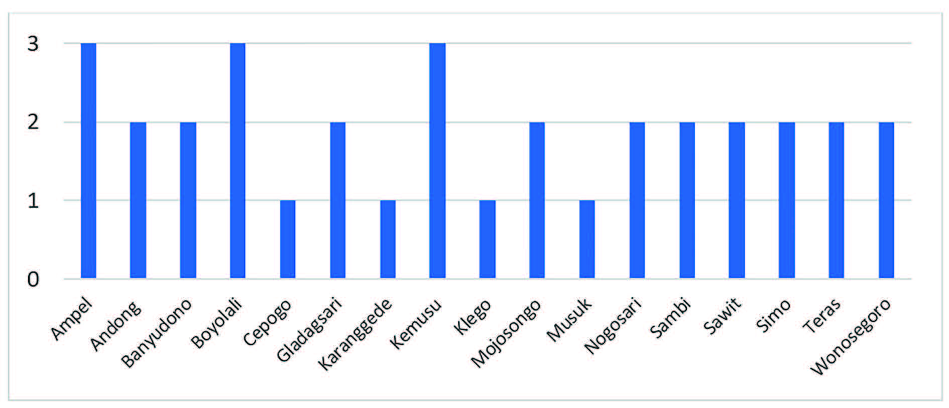 The respondents came from 17 out of 22 districts in Boyolali Regency. The subdistricts with no representative were Juwangi, Ngemplak, Selo, Tamansari, and Wonosamodro. The majority of respondents came from Ampel, Boyolali, and Kemusu.