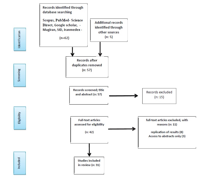 Initially, articles containing one or more of the predefined keywords in the title or text were selected. Abstracts of articles published in Persian and English were screened for eligibility according to the inclusion criteria. Following the removal of ineligible studies, the full texts of the remaining articles were reviewed. Data regarding the father’s role in abortion decision-making were extracted and provided to a second researcher for verification and correction (Figure 1).